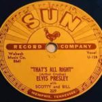 It all began for Elvis in 1954 when he stopped by Sun Records to record “My Happiness” as a birthday present for his mother. It was the genius of Sun Record owner Sam Phillips and the raw talent of a young man with a golden voice that launched the greatest Rock N Roll career of all time. Elvis’ first single on Sun Records was “That’s All Right.” Today the 78 rpm version and the 45 are each worth up to $1,200.00. Both are seen here.