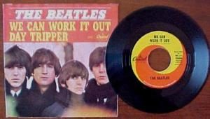 99% of the time an original release of a record is worth more than a re-issue. But there are exceptions. An example would be the Beatles’ two-sided hit “We Can Work It Out” and “Day Tripper.” An original 1966 copy on an orange and yellow Capitol Records label is worth up to $40.00. Add up to another $40.00 for the picture sleeve. However, a 1969 re issue on a red and white Capitol label, as shown on the left, is worth up to $1,000.00 today.