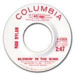 In 1963, with the release of the album “The Freewheelin’ Bob Dylan,” Columbia Records sent radio stations promo copies of “Blowin’ in the Wind.” A copy is worth up to $700.00. Also included was a sleeve, blank on front and a “Rebel with a Cause” description of Dylan on the back, which begins with the words “Twenty-one-year old Bob Dylan has become in one short year the most talked about folk music talent in more than a decade.” The sleeve, as shown here, is also worth up to $700.00 by itself. You can find the value for all “promo” records in “Mighty John’s Promo Records Guide,” by clicking the link in the yellow strip above.